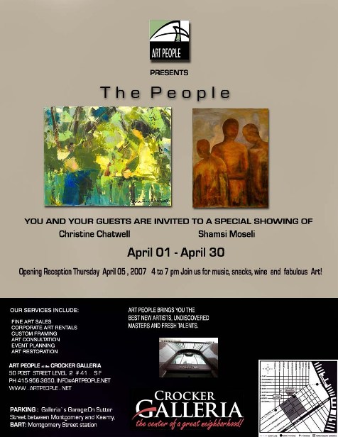 ![]() The People YOU AND YOUR GUESTS ARE INVITED TO A SPECIAL SHOWING OF Christine Chatwell Shamsi Moseli April 01 to April 30 CROCKER GALLERIA . 50 POST ST # 41 SAN FRANCISCO,CA 94104 pH 415-956-3650 .......www.artpeoplesf.net........ .........info@artpeoplesf.net.......... Last edited by guest_1209 : 04-03-2007 at 07:13 AM. |